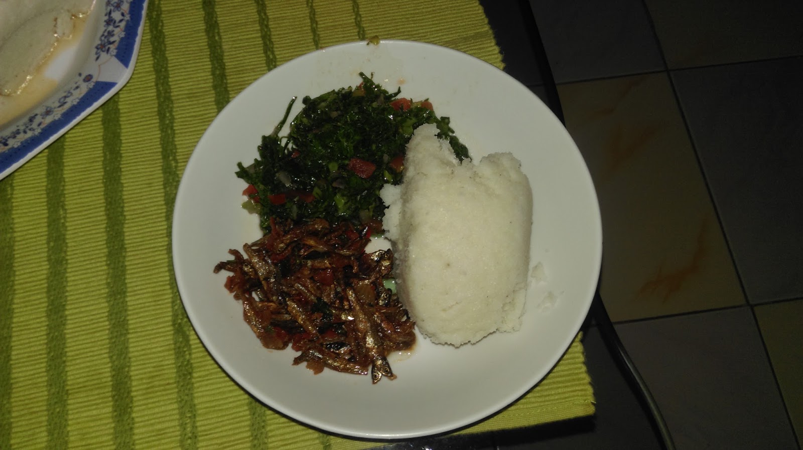Hier kleine Fische, ähnlich zu Sprotten, zubereitet mit Ingwer und Knoblauch zusammen mit Ugali und Sukuma wiki (ähnlich zu Spinat)